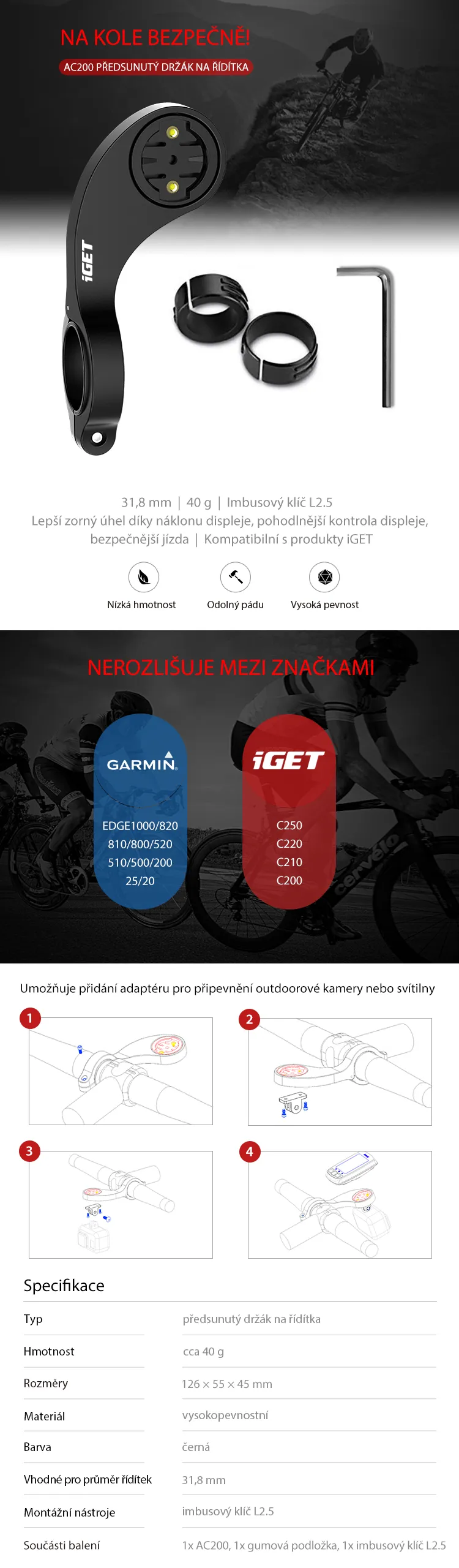 Předsunutý držák iGET CYCLO AC200 na kolo pro cyklocomputery iGET. Kompatibilní s cyklocomputery Garmin.