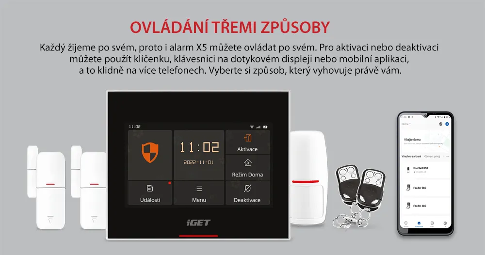 Mějte svůj domov pod kontrolou s inteligentním systémem chytré domácnosti iGET HOME Alarm X5. Senzory jsou bezdrátové, a hlavní jednotka s vaším telefonem komunikuje pomocí Wi-Fi sítě nebo zasíláním SMS zpráv pomocí GSM. Rozumí si s Androidem i iOS, v aplikaci můžete sledovat vnitřní a venkovní IP kamery iGET HOME, řídit 230V zásuvky, ovládat vysavač, termohlavice, osvětlení a dalších více než 300 typů univerzálního příslušenství. Upravit nastavení tak můžete vzdáleně odkudkoliv. Alarm dále nabízí chytré funkce a snadné ovládání pomocí dotykového displeje. Velmi nízká spotřeba do 3 W, elegantní tenký design. Manuál i aplikace iGET HOME jsou kompletně v českém, slovenském, polském, maďarském a anglickém jazyce.