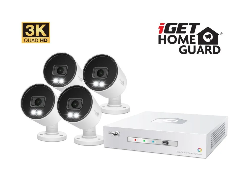 Kamerový systém iGET HOMEGUARD HGDVK83304 se SMART detekcí pohybu, LED svícením a nahráváním zvuku - 8-kanálový 3K rekordér DVR + 4x barevná 3K venkovní kamera s LED světlem a IR nočním viděním a zvukem, USB myš, 5x kabeláž, 2x adaptér, porty HDD SATA, LAN, USB, HDMI, BNC, komprese H.265.