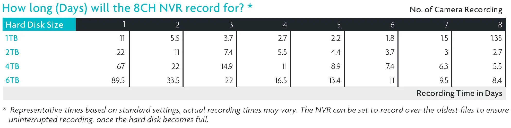 - kamery se připojují k rekordéru pomocí 18,3 m dlouhých napájecích/video kabelů které jsou součástí balení (obsahují video i napájení v jednom kabelu)