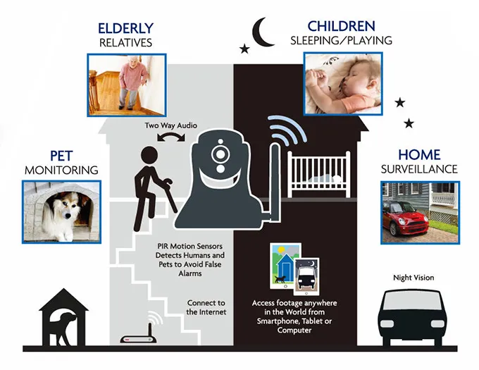 Bezdrátové připojení pomocí WiFi obsahuje silné zabezpečení 64/128-bit WEP, WPA/WPA2, WPA-PSK/WPA2-PSK, WPS. Kamera podporuje protokoly TCP/IP, DHCP, FTP, SMTP, NTP, UPNP, HTTP, UDP/IP, DDNS, P2P.